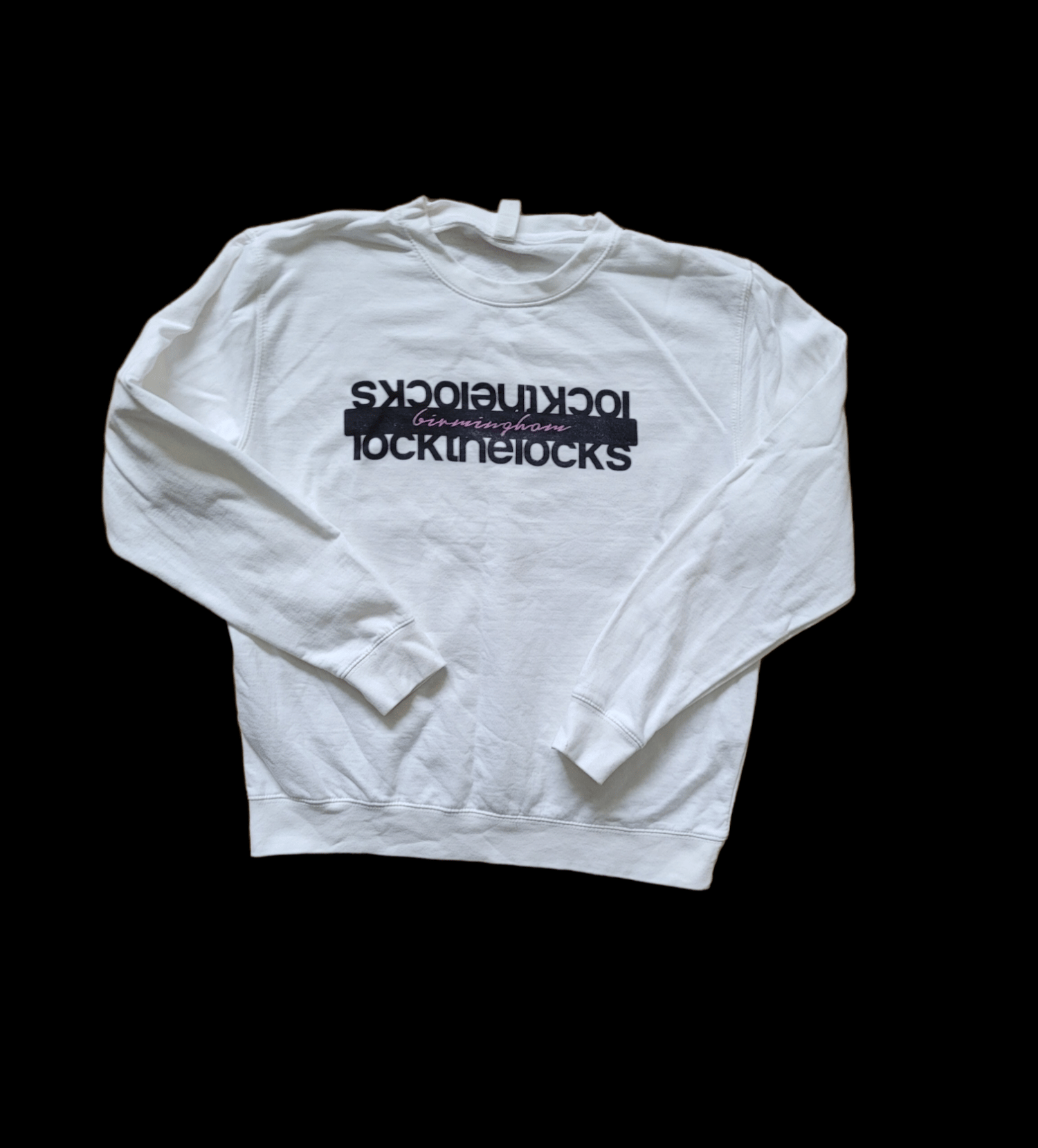 Our latest sweater comes in white with black print or black with white print featuring Lockthelocks and a contrasting Birmingham design.